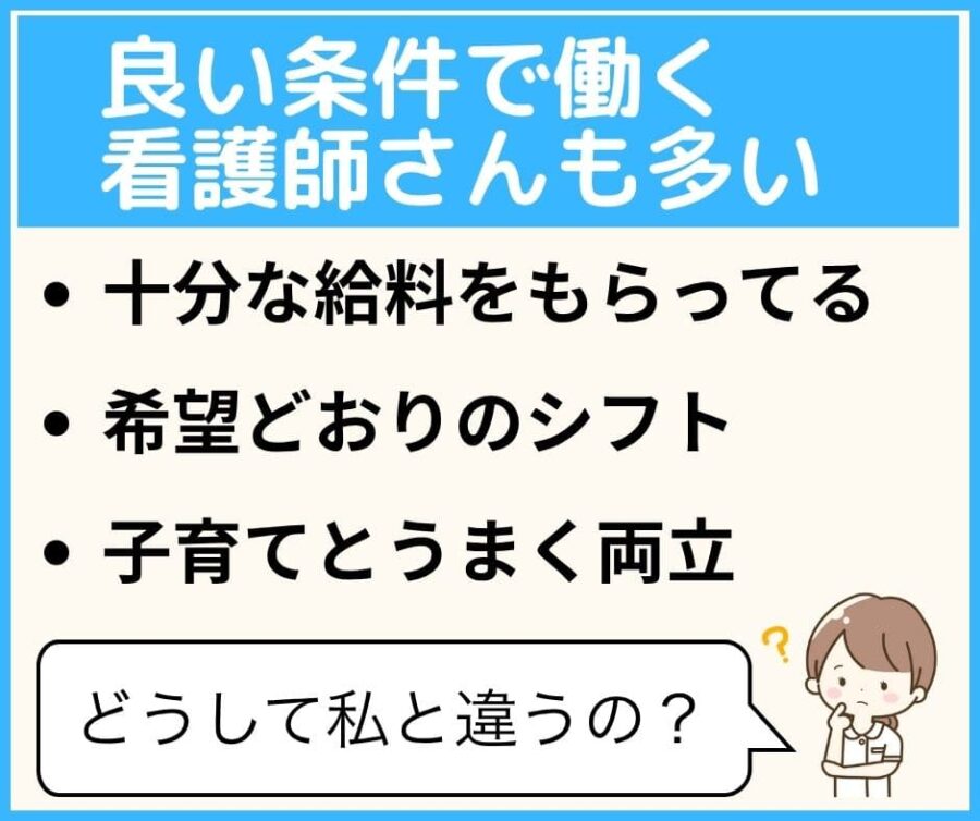 でも、世の中には、うまく転職して良い条件で勤務している看護師さんがいるのも事実です。