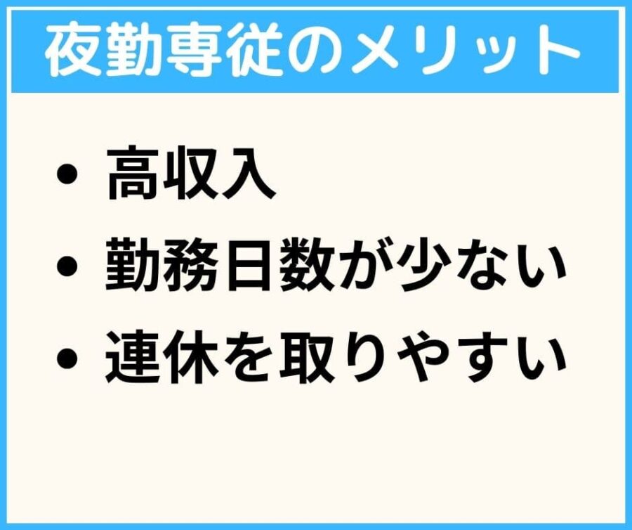 夜勤専従は、夜勤の回数に応じて夜勤手当が支給されるので、その分高収入になります。