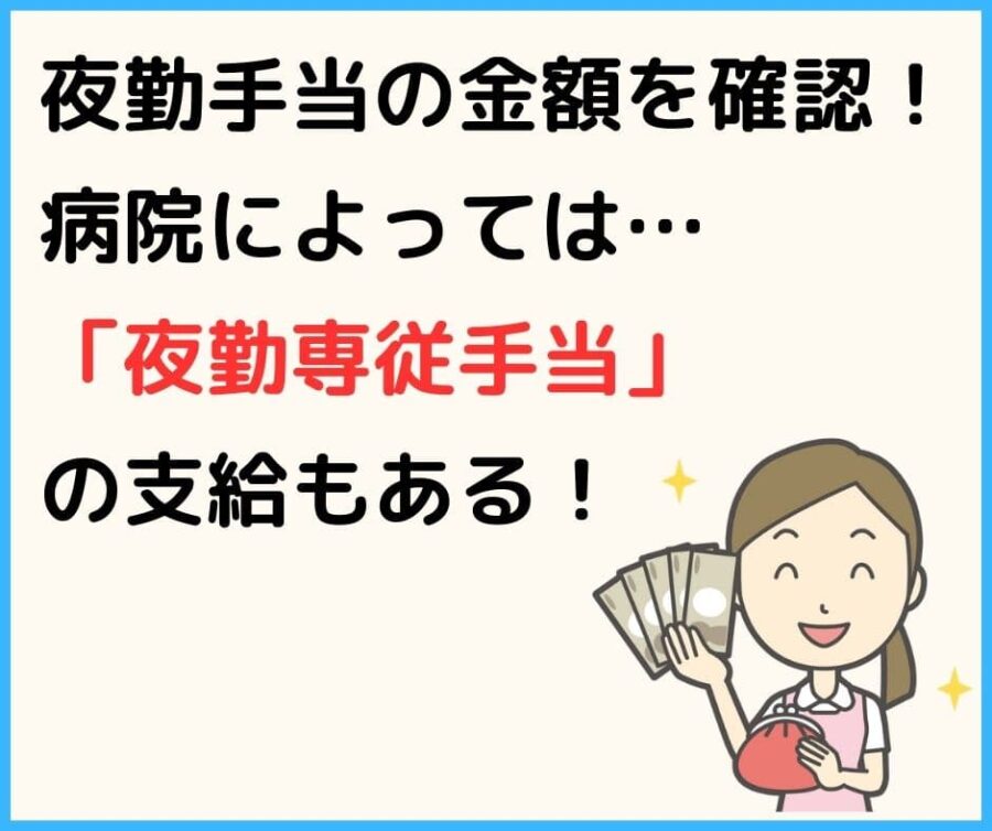 病院によっては、通常の夜勤手当に加えて「夜勤専従手当」が支給される場合もあるので、こちらも必ずチェックしてください。