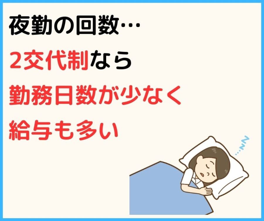 2交代制、3交代制がありますが、勤務日数を減らしたい場合は、2交代制の病院を選ぶといいでしょう。