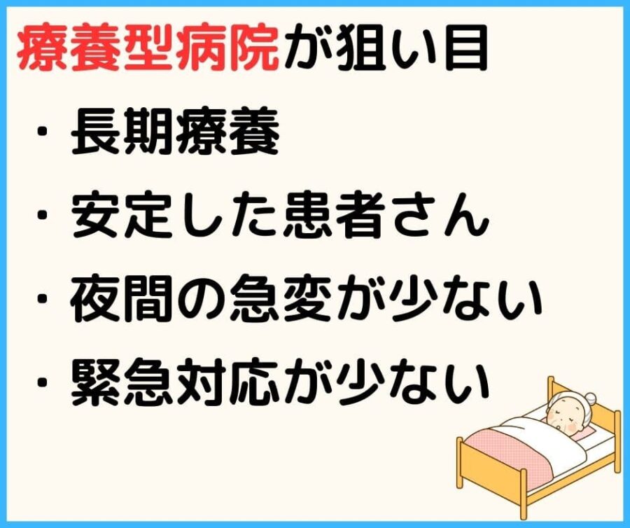 療養型病院とは、長期の療養で、比較的病状が安定している患者さんが多いです。
